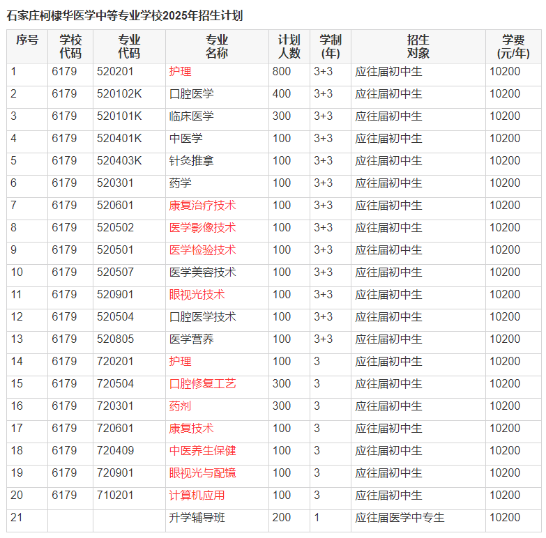 石家莊柯棣華醫學中等專業學校2025年招生專業如下: