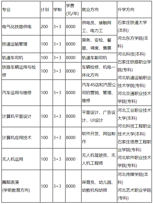 河北軌道交通中等專業學校,創辦于1994年,是一所經教育廳批準、教育部備案、面向全國招生的全日制普通中專學校。學校專業涵蓋鐵路運輸、汽車服務、信息技術、學前教育、人工智能無人機等多個大類,學生入學簽訂就業協議,為學生提供就業保障;學校同時與多所高等院校合作,學生畢業后可直接升入高等院校,繼續進行深造學習,取得國家承認的高等教育學歷文憑,實現大學夢想。